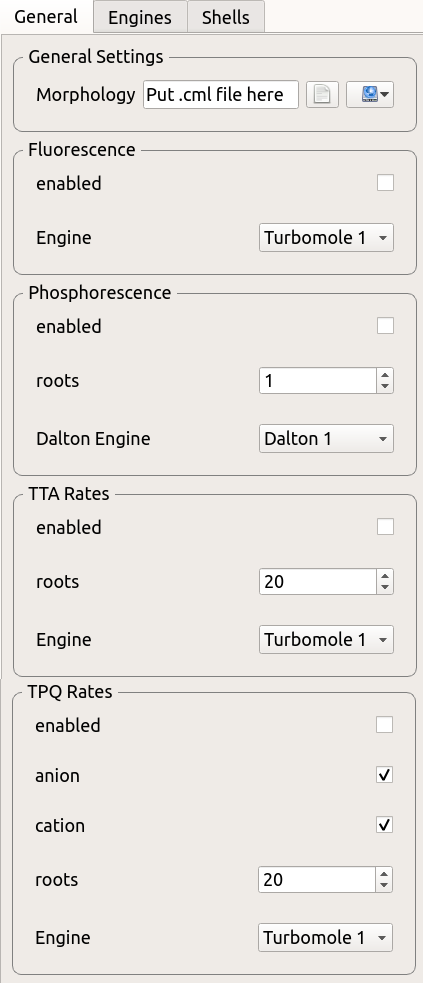 Import your morphology in the General Settings->Morphology field and seperately enable each analysis: Fluorescent, Phosphorescent, TTA and TPQ. Unless you have specific requirements leave all other options at their default. Note especially that only the Dalton engine is able to compute the quadratic response including spin-orbit coupling required for Phosphorescence. The specification of roots should also not be changed unless it is explicitly required to reach convergence. In the TPQ field, you can specify if TPQ rate input should be computed for quenching between Triplets and anions, Triplets with cations, or both.